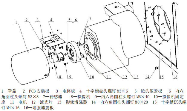 2、依次用2個(gè)M3×6十字槽沉頭螺釘、2個(gè)M3×6內(nèi)六角圓柱頭螺釘將傳感器、電 機(jī)和濾光片固定在攝像機(jī)固定座上,用十字螺絲刀擰緊螺釘。 3、在安裝完影像增強(qiáng)器后,安裝攝像機(jī)固定座,用3個(gè)M6×40內(nèi)六角圓柱頭螺釘 將其固定在影像增強(qiáng)器上擰緊。然后用3個(gè)M3×8內(nèi)六角圓柱頭螺釘將3塊鏡頭壓緊板 把攝像機(jī)壓緊。(注意:保護(hù)好攝像頭不損壞) 4、用3個(gè)M3×8內(nèi)六角圓柱頭螺釘將 PCB安裝板鎖緊,再用4個(gè)M3銅螺柱和4個(gè)M3×6十字槽沉頭螺釘把PCB板固定在PCB安裝板上。 5、安裝罩蓋,將罩蓋用M3×8十字槽盤頭螺釘固定在攝像機(jī)固定座上,影像增強(qiáng)器電路系統(tǒng)安裝完成。 |