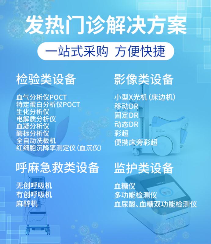 發(fā)熱門診建設(shè)中,具體包括五點(diǎn)要求:一、位置要求:發(fā)熱門診建設(shè)應(yīng)當(dāng)遵循“平戰(zhàn)結(jié)合”的原則,既能滿足日常感染性疾病的診斷服務(wù),又能應(yīng)對重大疫情,并與其他區(qū)域隔離,防止交叉?zhèn)魅尽?/span> 二、分區(qū)要求:滿足“三區(qū)兩通道”設(shè)置要求。按照分設(shè)清潔區(qū)、污染區(qū)、半污染區(qū),醫(yī)務(wù)通道、患者通道,實(shí)行閉環(huán)管理,發(fā)熱門診掛號、就診、檢驗(yàn)、取藥等診療活動全部在區(qū)域內(nèi)完成。 三、設(shè)備配備:按照填平補(bǔ)齊的原則,配備各類醫(yī)療設(shè)備,具體可以分為四類,病床、轉(zhuǎn)運(yùn)平車類的基礎(chǔ)設(shè)備;心肺復(fù)蘇儀、呼吸機(jī)等搶救和生命支持類設(shè)備;生化儀、血?dú)夥治鰞x等檢驗(yàn)類設(shè)備和CT、數(shù)字化DR等影像類設(shè)備。 普朗醫(yī)療推出一站式打包采購抗疫醫(yī)療設(shè)備,讓您更方便地買到更適合的產(chǎn)品,具體包括:臨床檢驗(yàn)設(shè)備: 血?dú)夥治鰞x、 特定蛋白分析儀、電解質(zhì)分析儀、生化分析儀、酶標(biāo)分析儀、全自動洗板機(jī)、血凝儀、血沉儀;醫(yī)學(xué)影像設(shè)備:床邊拍片機(jī)、移動DR、數(shù)字化DR、動態(tài)DR、彩超、便攜床旁彩超;呼麻急救設(shè)備:無創(chuàng)呼吸機(jī)、有創(chuàng)呼吸機(jī)、麻醉機(jī);監(jiān)護(hù)設(shè)備:血糖儀、血尿酸、血糖雙功能檢測儀。