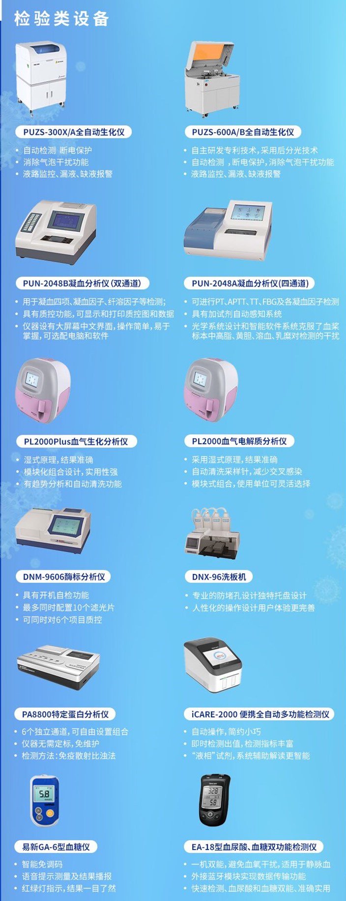 新型肺炎在病情監(jiān)測和治療監(jiān)測時(shí)需要密切監(jiān)測患者的生化指標(biāo),根據(jù)指標(biāo)的進(jìn)一步調(diào)整治療方案。 紅細(xì)胞沉降率測定儀是用來檢測紅細(xì)胞沉降率,也就是血沉,新型肺炎患者大多數(shù)患者的血沉?xí)仙?,血沉的檢查雖然不具有特異性。但是作為鑒別診斷,往往可以做血沉檢查協(xié)助鑒別其他疾病。 血凝分析儀用來檢測凝血四項(xiàng)及凝血因子等凝血指標(biāo),凝血異常與新型肺炎患者不良預(yù)后相關(guān),大部分死亡病例存在彌散性血管內(nèi)凝血(DIC),因此對于新型肺炎患者,特別是重癥患者,了解其凝血特征、密切監(jiān)測凝血指標(biāo),有助于早期干預(yù)、降低病死率。 血?dú)夥治鰞x不僅檢測包括血液氣體及酸堿平衡狀態(tài)分析,還包括乳酸等代謝物、電解質(zhì)的分析,對于判斷新型肺炎患者臨床分型、急危重病患的搶救、呼吸衰竭的診斷檢測等具有重要作用。在新型肺炎的治療方案中,符合氧飽和度≤93%或動(dòng)脈血氧分壓(PaO2)/吸氧濃度(FiO2)≤300mmHg中任何一條就可以判斷為重癥患者。 特定蛋白分析儀可以檢測患者的C-反應(yīng)蛋白(CRP), C-反應(yīng)蛋白可以作為一項(xiàng)檢測炎癥的指標(biāo),在急性炎癥反應(yīng)階段其含量可迅速升高?;疾r(shí),盡早治療是至關(guān)重要的。 生物安全柜是用來保護(hù)操作者本人、實(shí)驗(yàn)室環(huán)境以及實(shí)驗(yàn)材料的,為操作診斷性標(biāo)本、原代培養(yǎng)物以及病菌毒株等具有感染性的實(shí)驗(yàn)材料時(shí)提供防護(hù),使其避免暴露于上述操作過程中可能產(chǎn)生的感染性氣溶膠和濺出物。在進(jìn)行新型冠狀病毒檢測檢驗(yàn)活動(dòng),如核酸檢測、血常規(guī)及血型檢測、尿干化學(xué)檢測、生化及免疫學(xué)檢測、便常規(guī)和血清G試驗(yàn)等時(shí),都必須在生物安全二級(jí)的實(shí)驗(yàn)室中進(jìn)行。 血液細(xì)胞分析儀是用于臨床血常規(guī)檢測的儀器,血常規(guī)檢查就是對血液中的有形成分即紅細(xì)胞、白細(xì)胞及血小板這三個(gè)系統(tǒng)的量和質(zhì)進(jìn)行檢測和分析,是基本的血液檢驗(yàn),是醫(yī)生診斷病情的常用輔助檢查手段之一。 尿液分析儀對泌尿系統(tǒng)、消化系統(tǒng)、心血管和內(nèi)分泌系統(tǒng)多種疾病的診斷、療效觀察,預(yù)后評估以及人群健康保健都有重要價(jià)值。 這樣多的臨床檢驗(yàn)設(shè)備,如果采購起來是不是很麻煩呢?為此,普朗醫(yī)療推出一站式采購解決方案,方便相關(guān)醫(yī)療機(jī)構(gòu)快速采購,具體的設(shè)備清單如下: