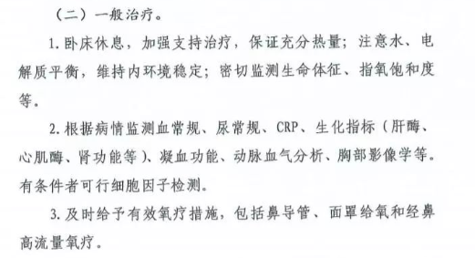 至今已經(jīng)第八版的《新型冠狀病毒感染的肺炎診療方案(試行第八版)》,里面明確指出:一般治療方案下,需要臥床休息,加強(qiáng)支持治療,保證充分熱量;注意水、電解質(zhì)平衡,維持內(nèi)環(huán)境穩(wěn)定;密切監(jiān)測生命體征、指氧飽和度等。根據(jù)病情監(jiān)測血常規(guī)、尿常規(guī)、CRP、生化指標(biāo)(肝酶、心肌酶、腎功能等)、凝血功能、動脈血氣分析、胸部影像學(xué)等。有條件者可行細(xì)胞因子檢測。及時給予有效氧療措施,包括鼻導(dǎo)管、面罩給氧和經(jīng)鼻高流量氧療。