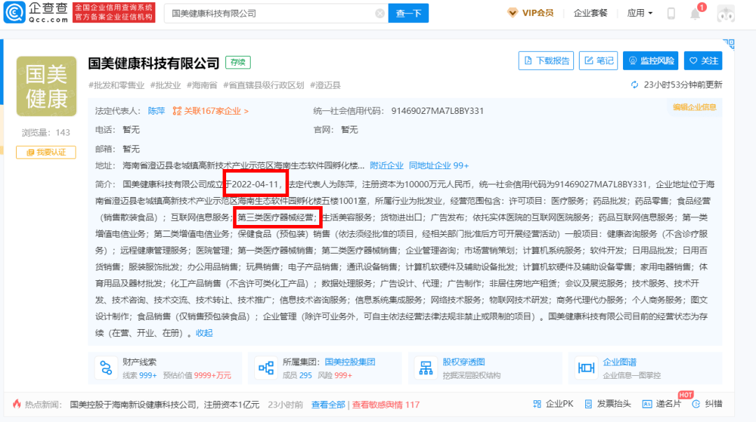 抖音電商宣布新增醫(yī)療器械銷售品類的四天后,國(guó)美也正式入局三類醫(yī)療器械。據(jù)企查查APP顯示,4月11日,國(guó)美健康科技有限公司成立,法定代表人為陳萍,注冊(cè)資本1億元。