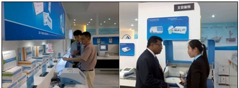 ![]() (圖為普朗工作人員向參觀者講解普朗醫(yī)療最新產(chǎn)品——PL銳鋒系列血?dú)怆娊赓|(zhì)分析儀)